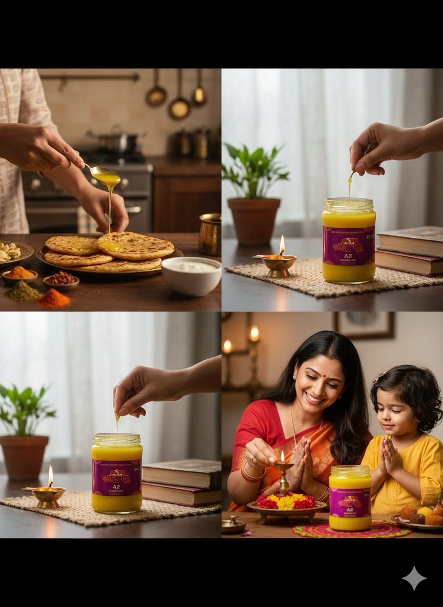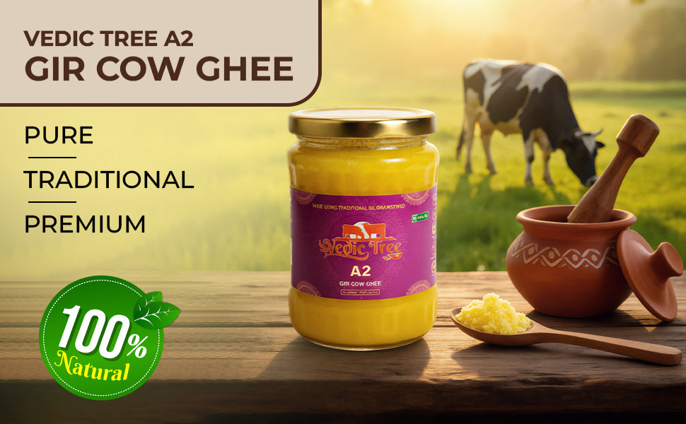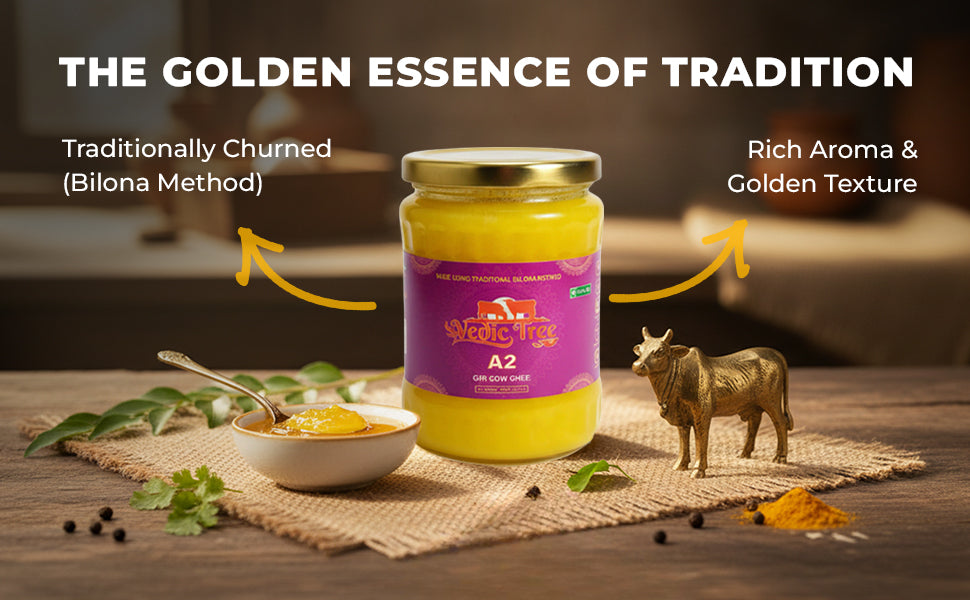 Authentic A2 Gir Cow Ghee, sourced directly from Indian farmers and handcrafted using the traditional Bilona method. Made from curd—not cream—this ghee preserves its natural aroma, grainy texture, and Ayurvedic potency.